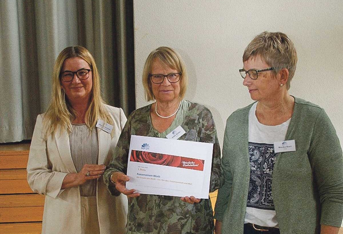 Grosse Ehre für den FRAUENVEREIN WORB. Am diesjährigen Preisausschreiben des Dachverbandes Schweizerischer Gemeinnütziger Frauen durften EDITH MÜLLER (Mitte) und MONIKA BURRI (links) den Preis für den ersten Platz entgegennehmen.